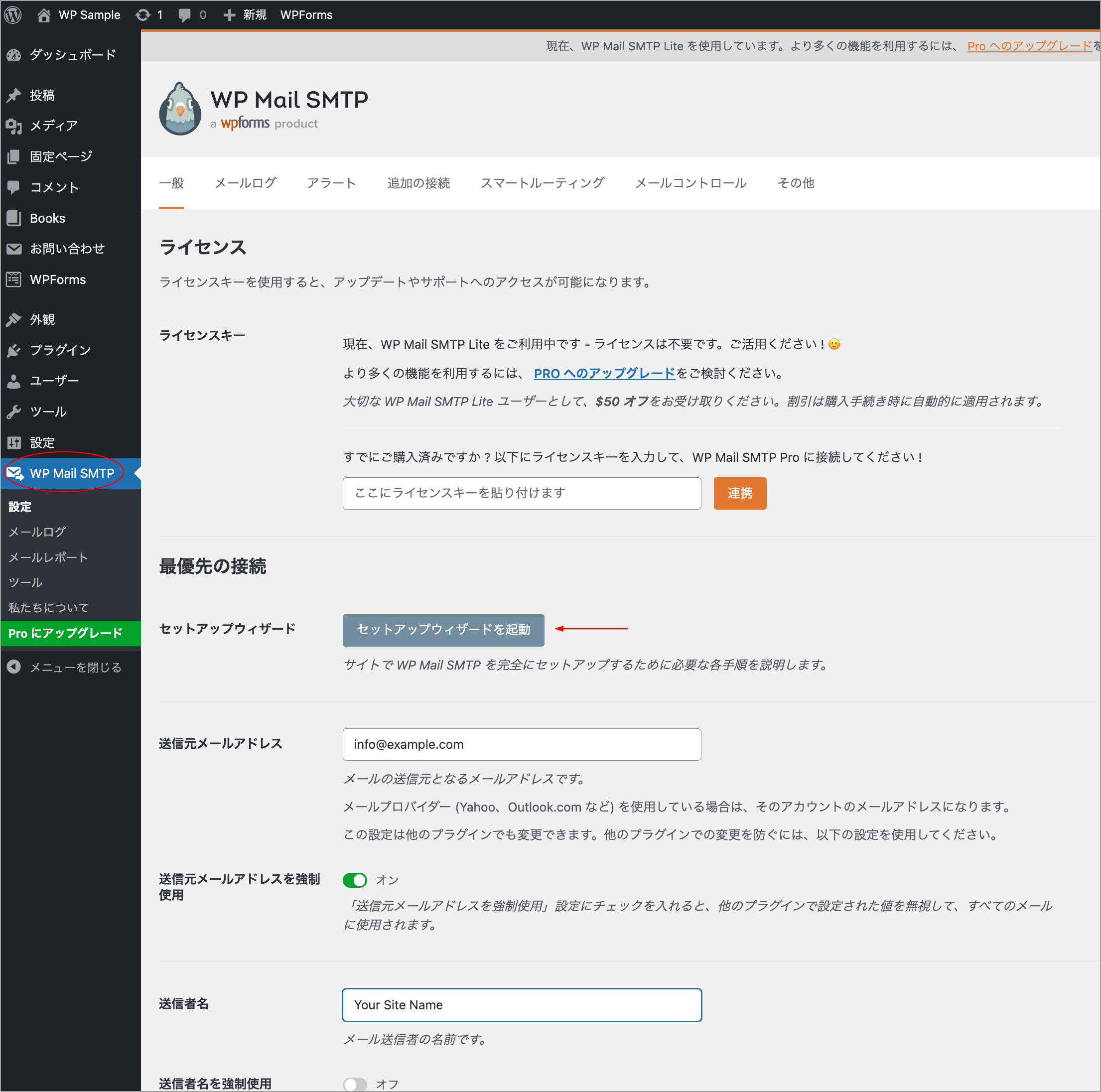 - または、「WP Mail SMTP」設定ページへ移動して SMTP サーバー情報を入力(この画面からセットアップウィザードを起動することもできます)