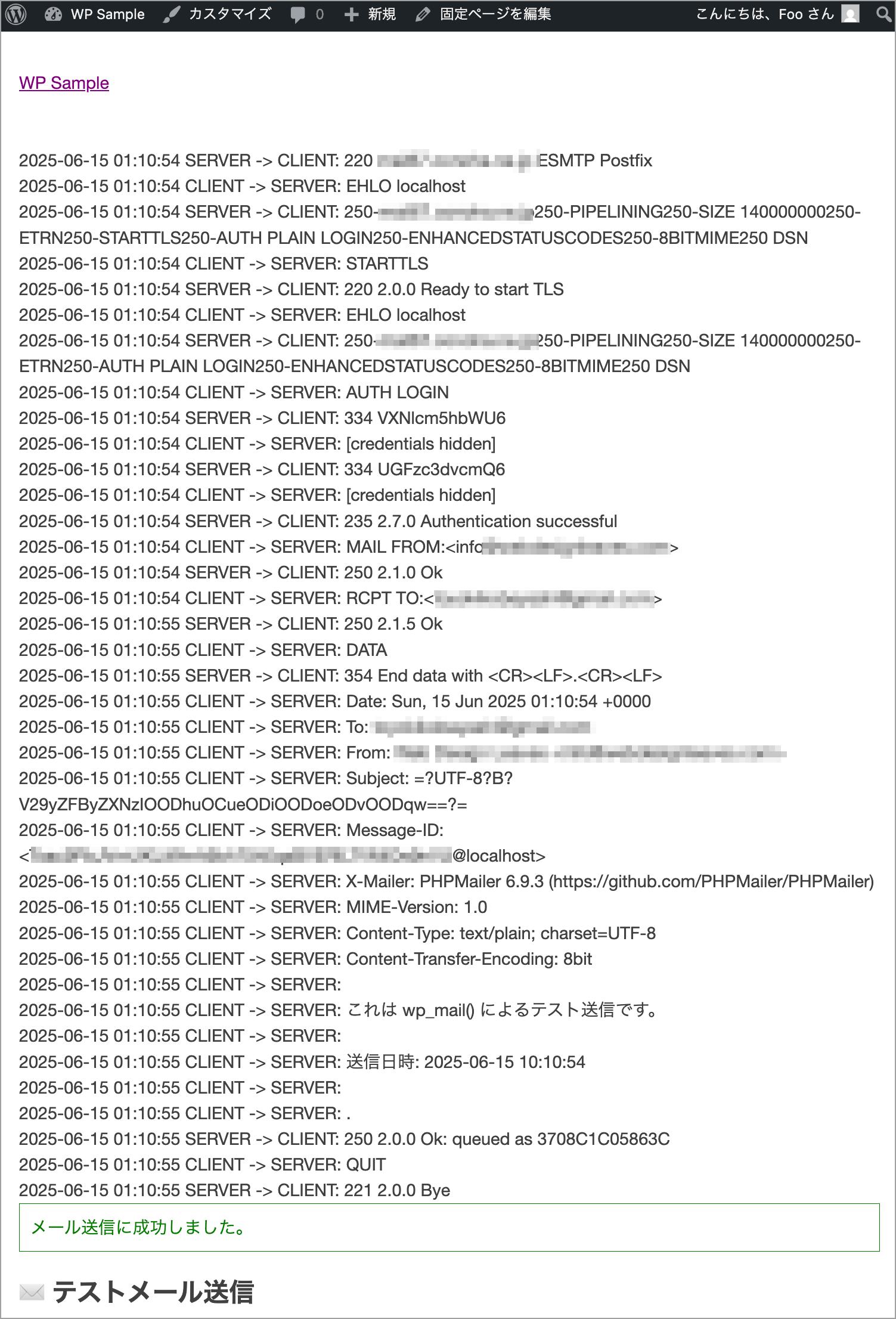 以下はメール送信成功時の出力例です(SMTP::DEBUG_SERVER を指定)。