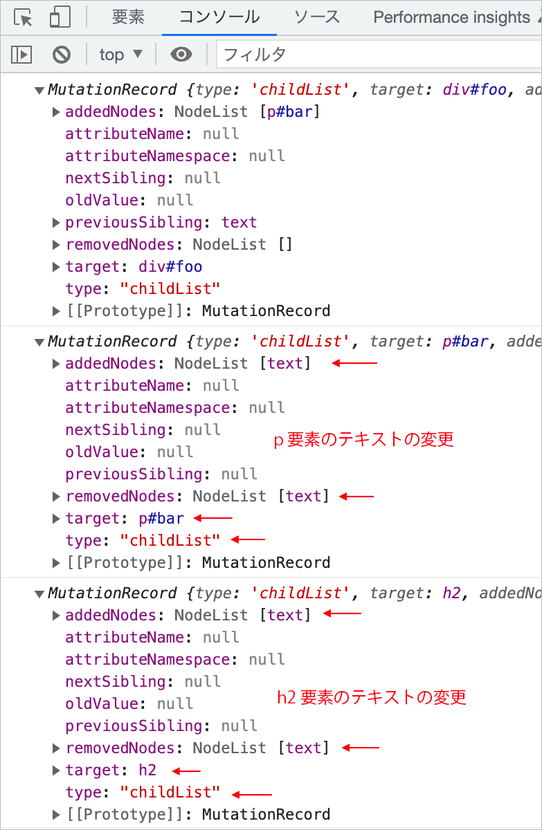 変更の内容を表す MutationRecord の type には変更の種類(監視オプションで指定した childList、attributes、characterData に対応)、target には対象ノードがセットされます。