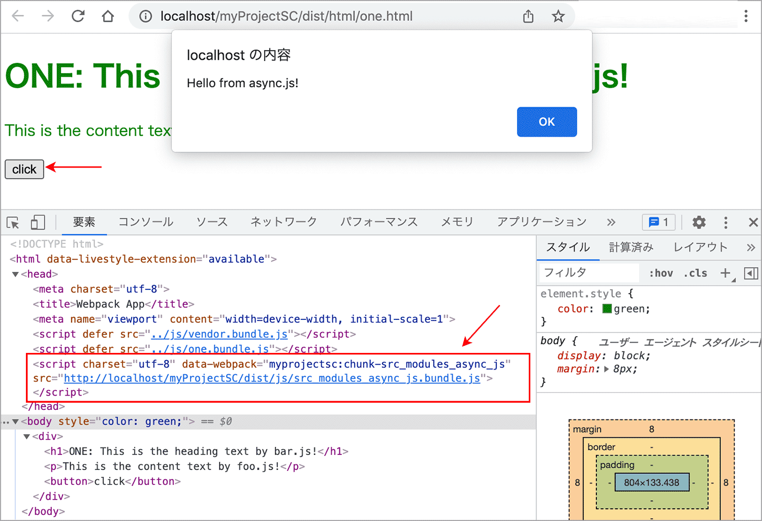 webpack-dev-server を終了して、webpack コマンドを実行すると実際に main.js が出力されます。その後 index.html をローカル環境で開けば変更を確認することができます。