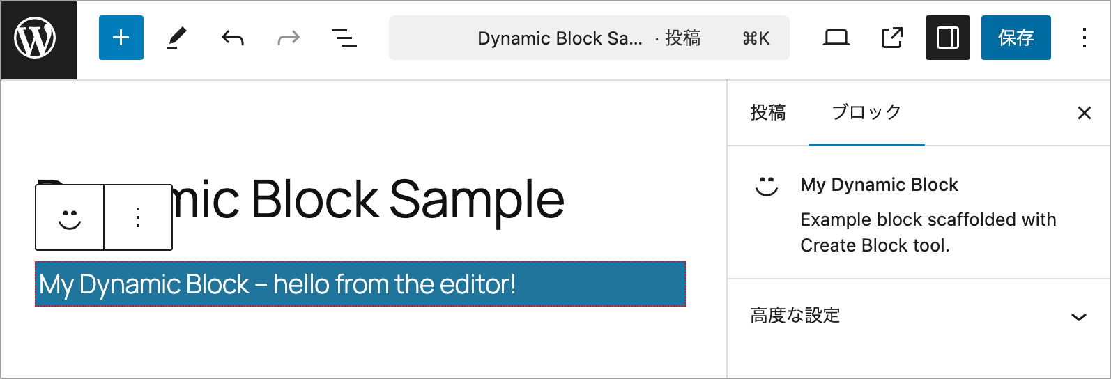この例では --variant=dynamic オプションを指定したので src/my-dynamic-block フォルダ内に render.php ファイルが作成されています(save.js は生成されません)。