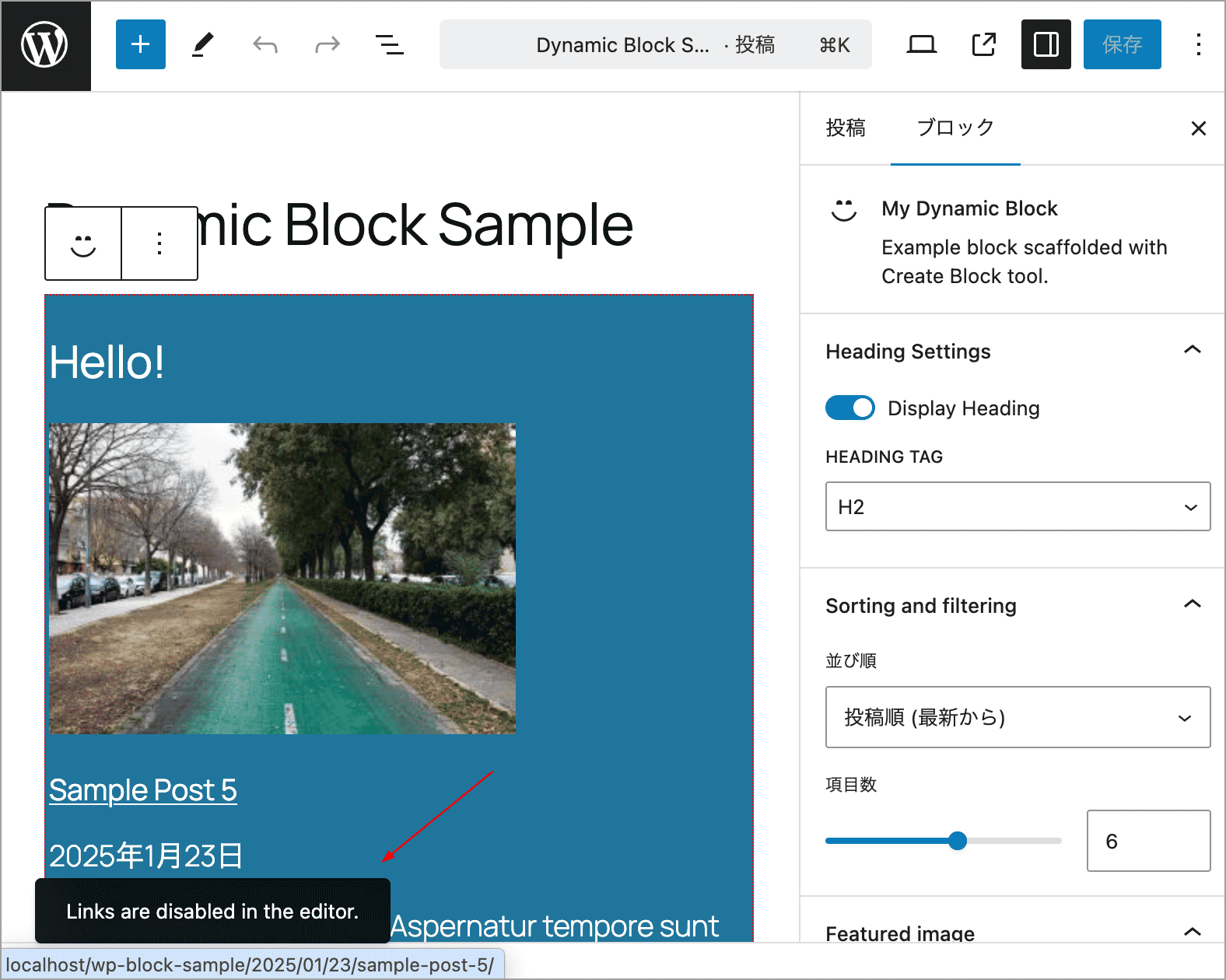 以下は投稿データにアクセスして、投稿記事一覧を表示するダイナミックブロックを作成する例です。