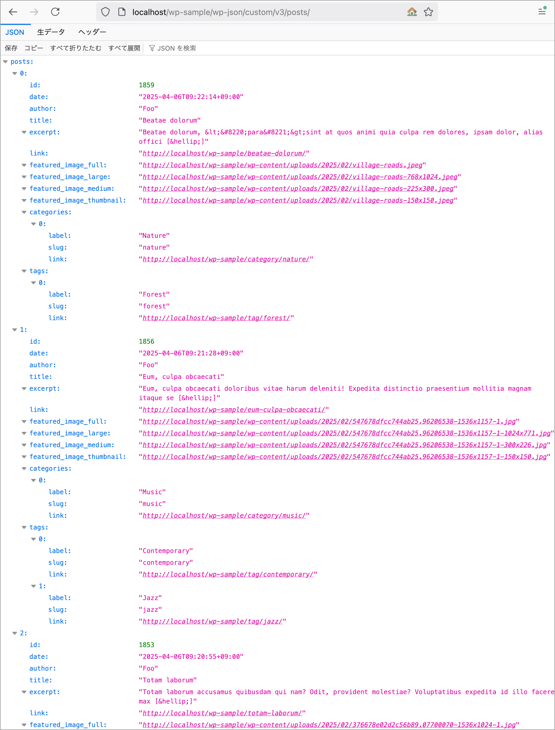 上記のコードを追加した状態で、以下の URL(example.com の部分は適宜変更)にアクセスすると、最新の投稿情報が JSON 形式で取得できます。