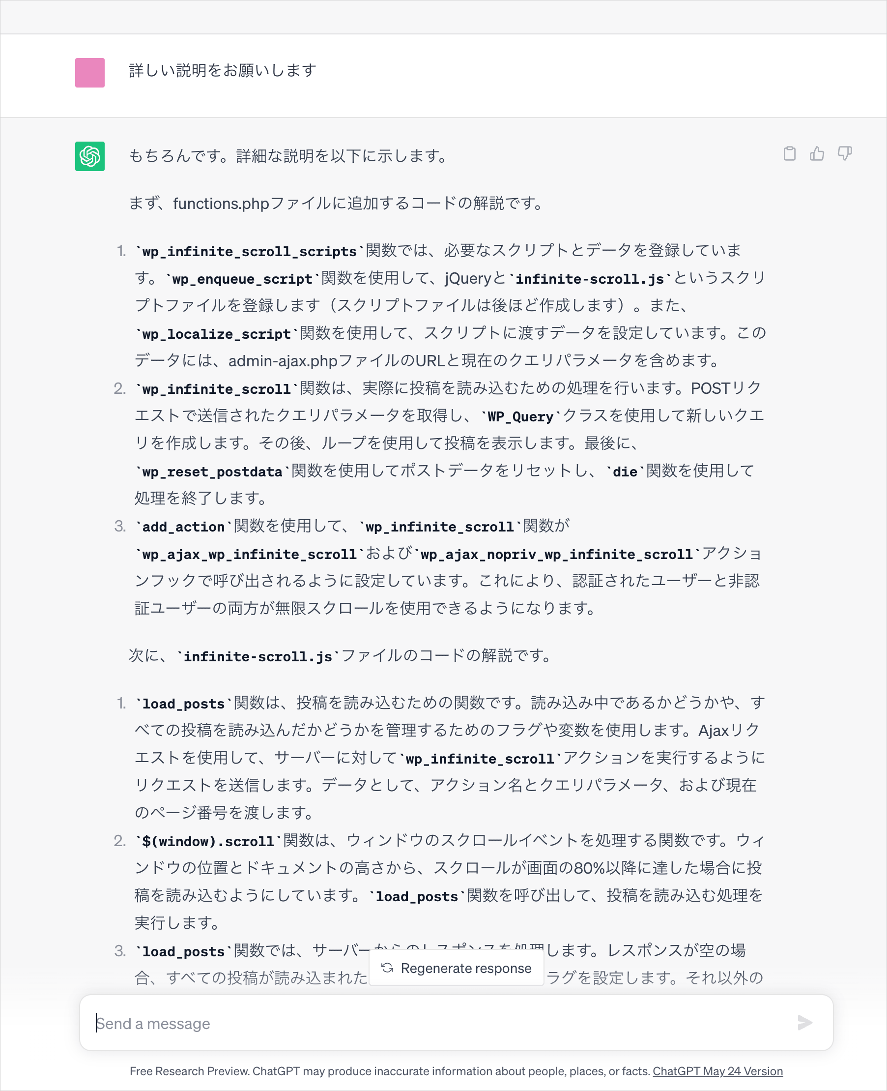 入力欄に「WordPress で AJAX を使った infinite scroll のコードを教えてください」と入力して return キーを押すと、ほんの数秒で ChatGPT から以下の回答が返ってきました。