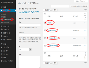 この例では「Event」「Exhibition」「Group Show」「Performance」というカスタム分類を作成し、「Event」を全てのカスタム分類の親カテゴリーとする。